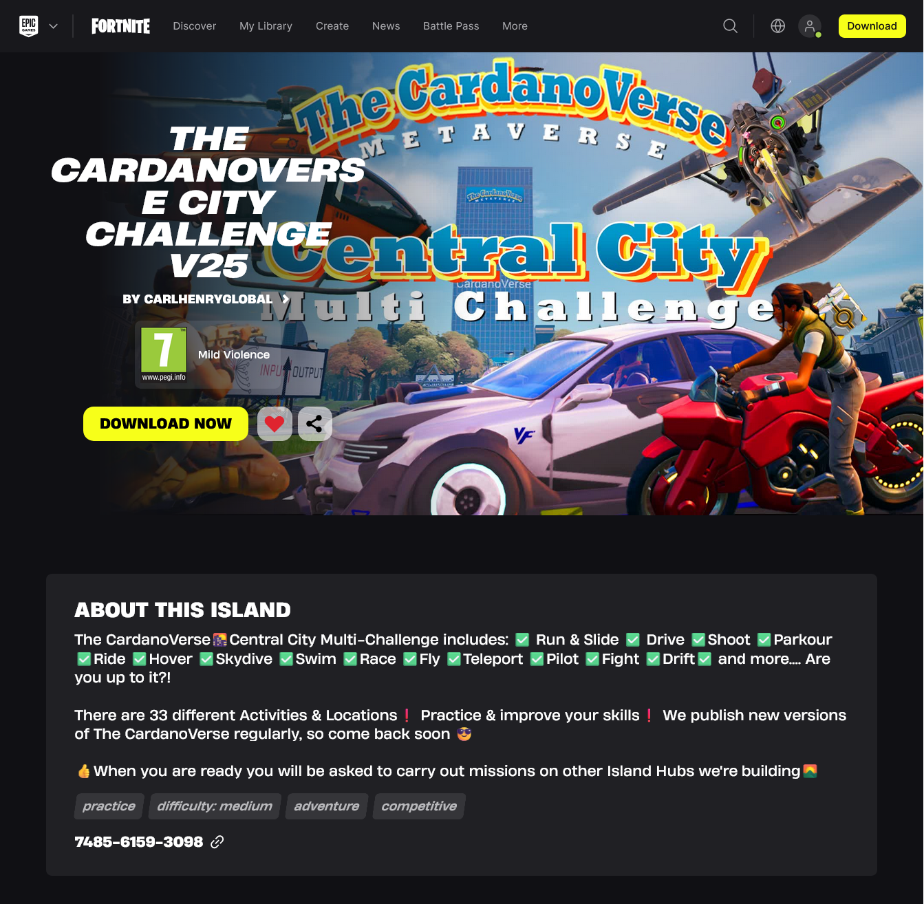 You can visit our first Island Hub in Fortnite The CardanoVerse Central City today! Free!